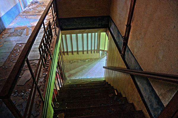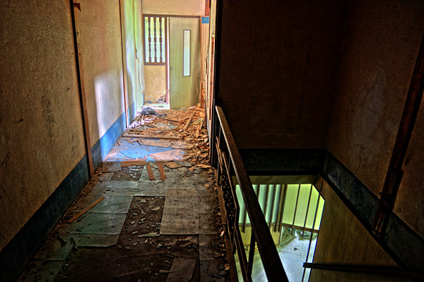 こちらも下りの赤い階段があるが、雨水のせいで木が腐って崩壊している。