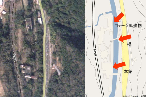 左に衛星写真、右に地図を並べて表示している。