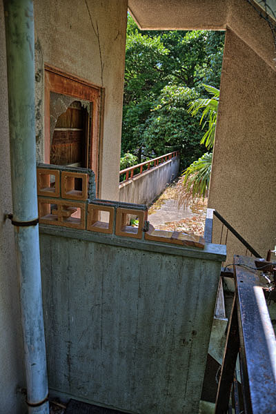2階のベランダと、階段エリアの境界部分。鉄条網がずらされており、乗り越えればここから入れそうだ。