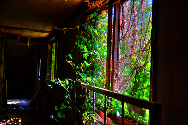 進入禁止のための板と、このツタの葉で、通路は日中であるにもかかわらずうす暗い。
